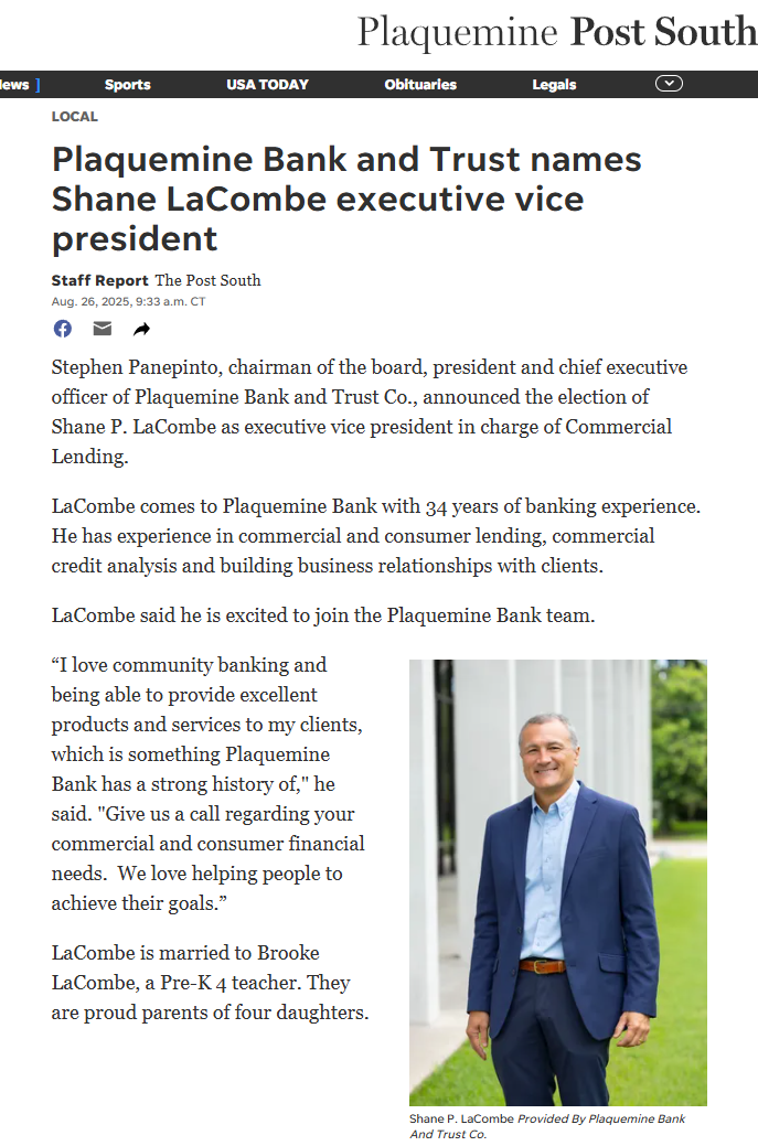 https://www.postsouth.com/story/news/local/2025/08/26/plaquemine-bank-and-trust-names-shane-lacombe-executive-vice-president/85830993007/ |