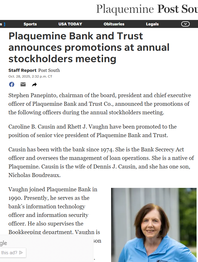 October, 2025 Plaquemine Bank announces two Senior Vice Presidents: Rhett Vaughn and Caroline Causin As seen in Plaquemine Post South