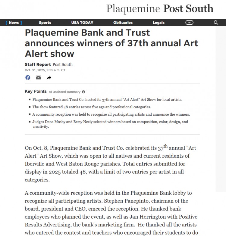 September 10, 2025 Plaquemine Bank Announces 37th Annual ART ALERT ART SHOW on October 8th and Names Two Judges As seen in Plaquemine Post South