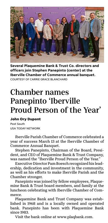 Stephen Panepinto, Chairman, President, & CEO of Plaquemine Bank & Trust Named Iberville Parish Chamber of Commerce "Iberville Proud Person of the Year!"