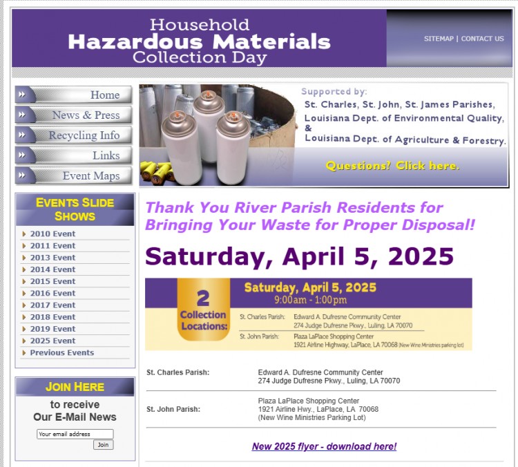 Household Hazardous Materials Collection Day The annual Household Hazardous Materials Collection Day is held in St. Charles, St. John the Baptist and St. James Parishes. Industry sponsors the event at two locations. www.hhmcd.com